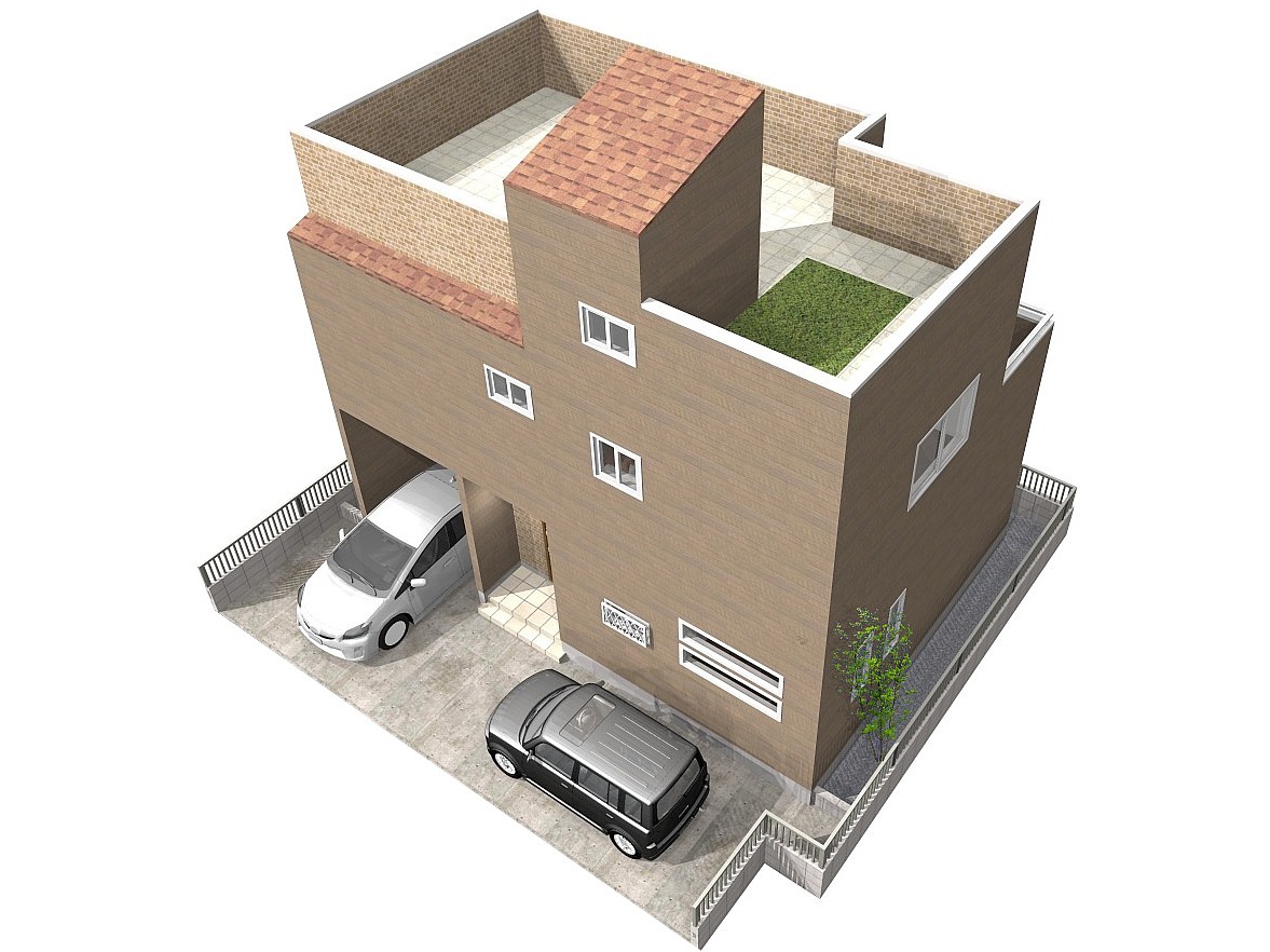 ファインメイド・プラスワンリビング 春日部市豊町5丁目 2月27日の写真です。 木目調とレンガ調の外壁が少し見えます。 玄関はアール型のおしゃれなドアなんです。 (完成をお楽しみに!) 屋上はタイル施工前です。